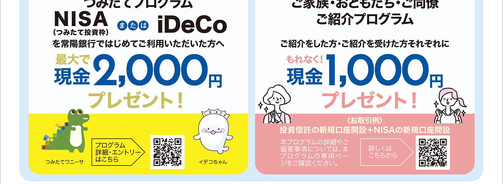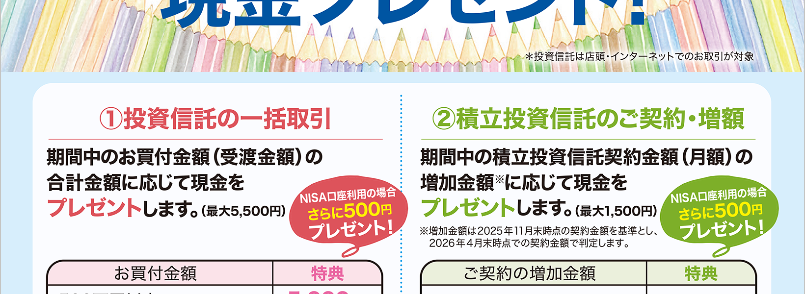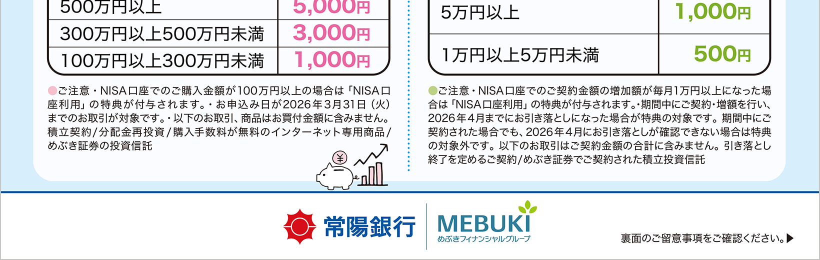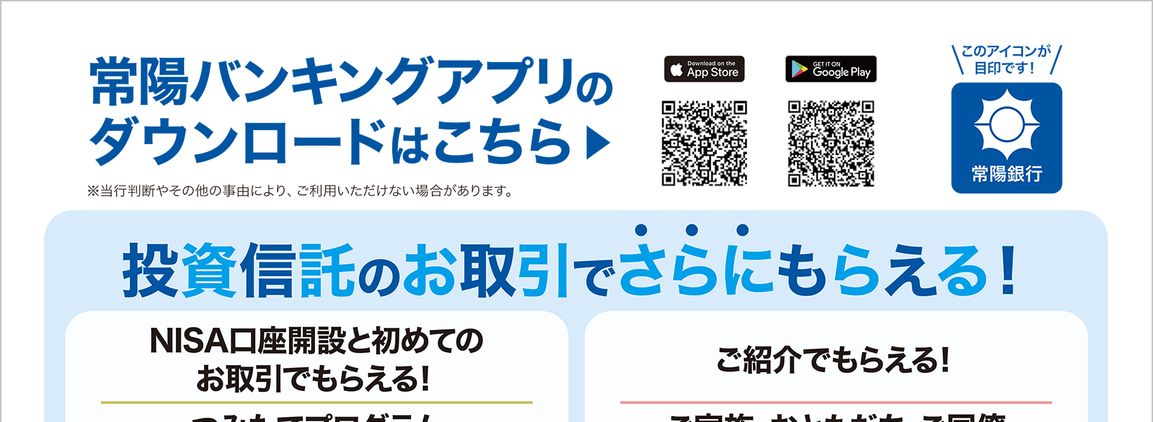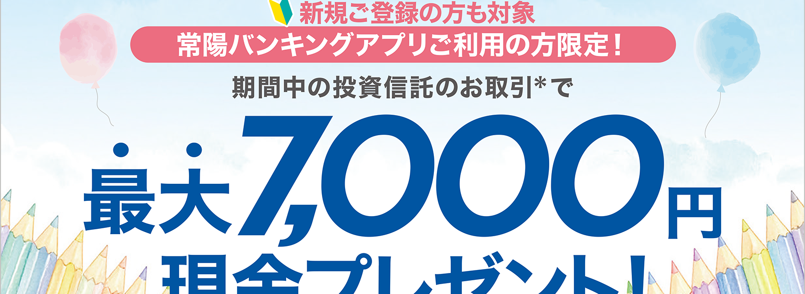 常陽バンキングアプリをご利用の方・新規ご登録の方限定!投資信託のお取引に応じて現金を最大7,000円プレゼントします!