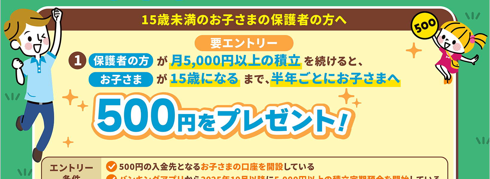 - お子さまの口座への10,000円以上の入金だけでは、本キャンペーンの特典対象とはなりません。「子育て応援定期」にエントリーいただき、所定の条件を満たす必要があります。