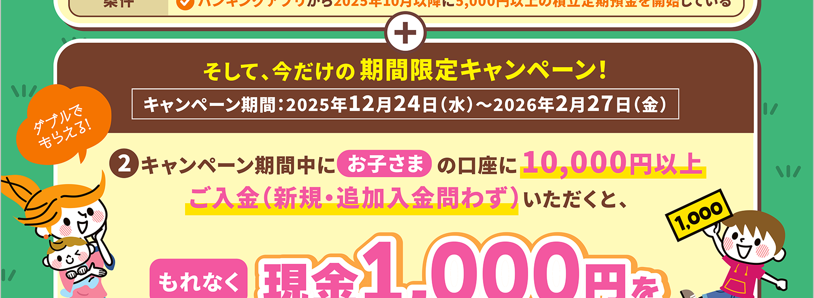 期間中、お子さまの口座に10,000円以上の入金をすると、さらに1,000円をプレゼント。
