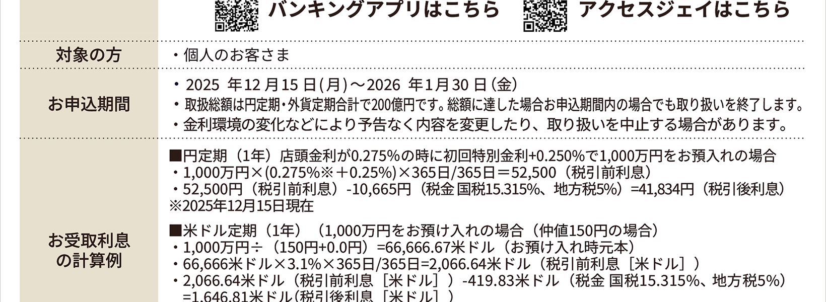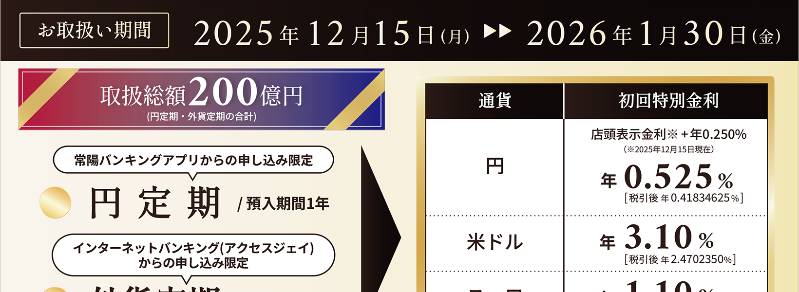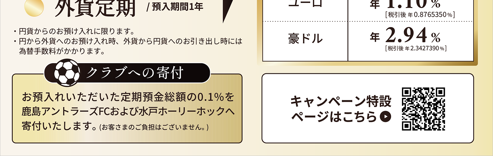 2025年12月15日(月)から2026年1月30日(金)まで、初回特別金利にてお預け入れいただける鹿島アントラーズ/水戸ホーリーホック優勝記念定期預金をバンキングアプリ限定でご用意しています(外貨定期預金はアクセスジェイ限定)。