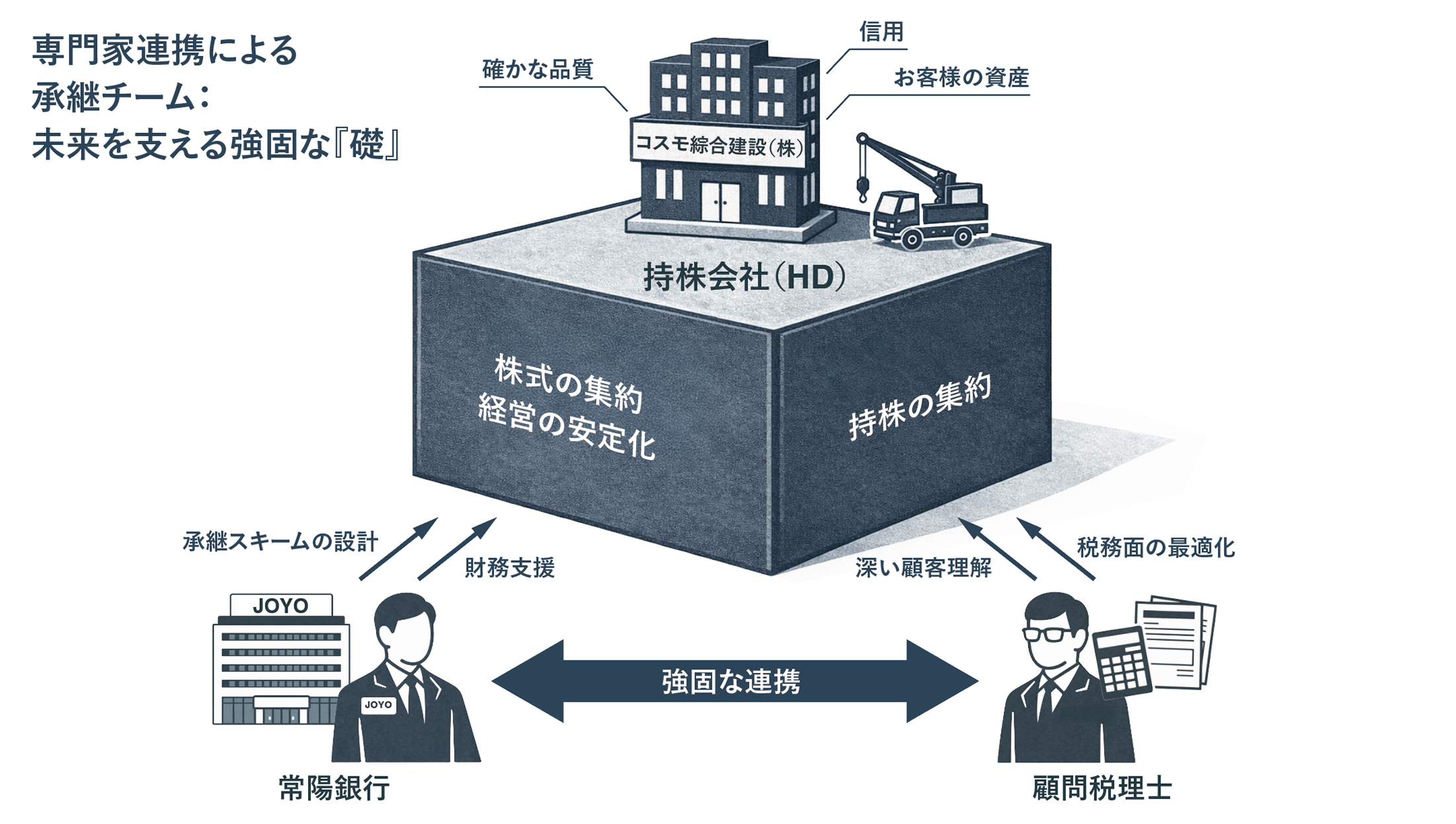 コスモ綜合建設株式会社様は、「啓発」「気概」「創造」の理念のもと地域の暮らしを支え続け、次世代への承継と資本政策の再設計に挑んでいます。常陽銀行はその歩みに伴走し、株価評価・資本設計から税務対応まで総合的な支援を行いながら、地域と共に未来を創る同社の挑戦をこれからに伴走してまいります。