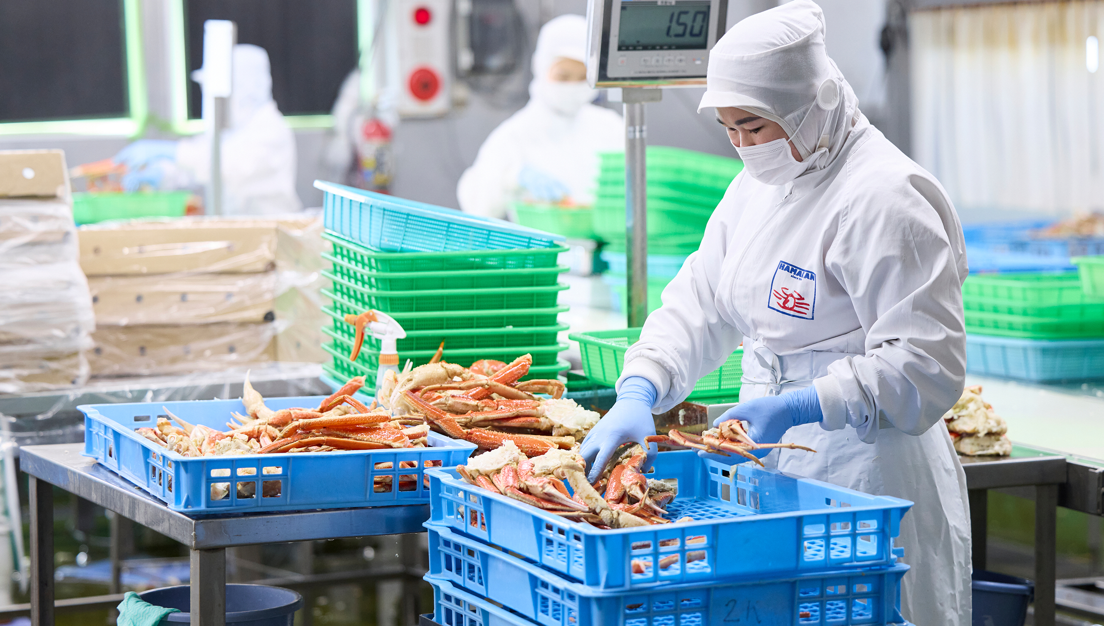海野氏 : 浜勘は創業100年を超える大洗町の老舗で、主力はカニの委託加工を中心とした水産加工です。製品の温度管理や凍結状態の調整、保存管理を徹底し、シュリンク包装技術で形と鮮度を長く保つことで差別化しています。経営理念に「感謝の心」を掲げ、顧客や従業員、地域社会など支えてくれるすべての人への感謝を商品に込めて健康で豊かな食生活への貢献を目指しています。自社の強みを活かしながら「蟹の浜勘」として知られる品質を守っていきます。