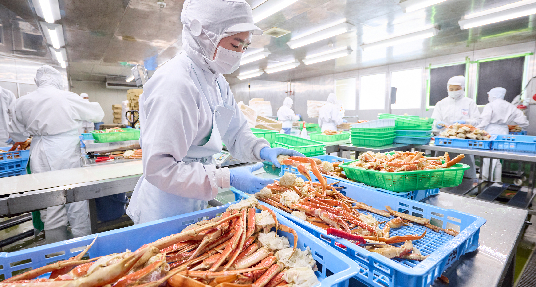海野氏 : これまでカニの委託加工を中心にしてきましたが、消費者に直接リーチする自社ブランドを確立することが必要と判断しました。そこで近年は「シーフードグラタン」「たらばがにシュリンク」「冷凍寿司」といった新商品に取り組み、最新設備で多種多様な冷凍・冷蔵食品加工を実現しています。自社ブランド商品の製造は、社員にとっても従来の委託製造とは異なるやりがいがあり、会社全体の活力になっています。品質管理体制は世界基準を目指し、安心・安全な商品の提供を常に心掛けています。