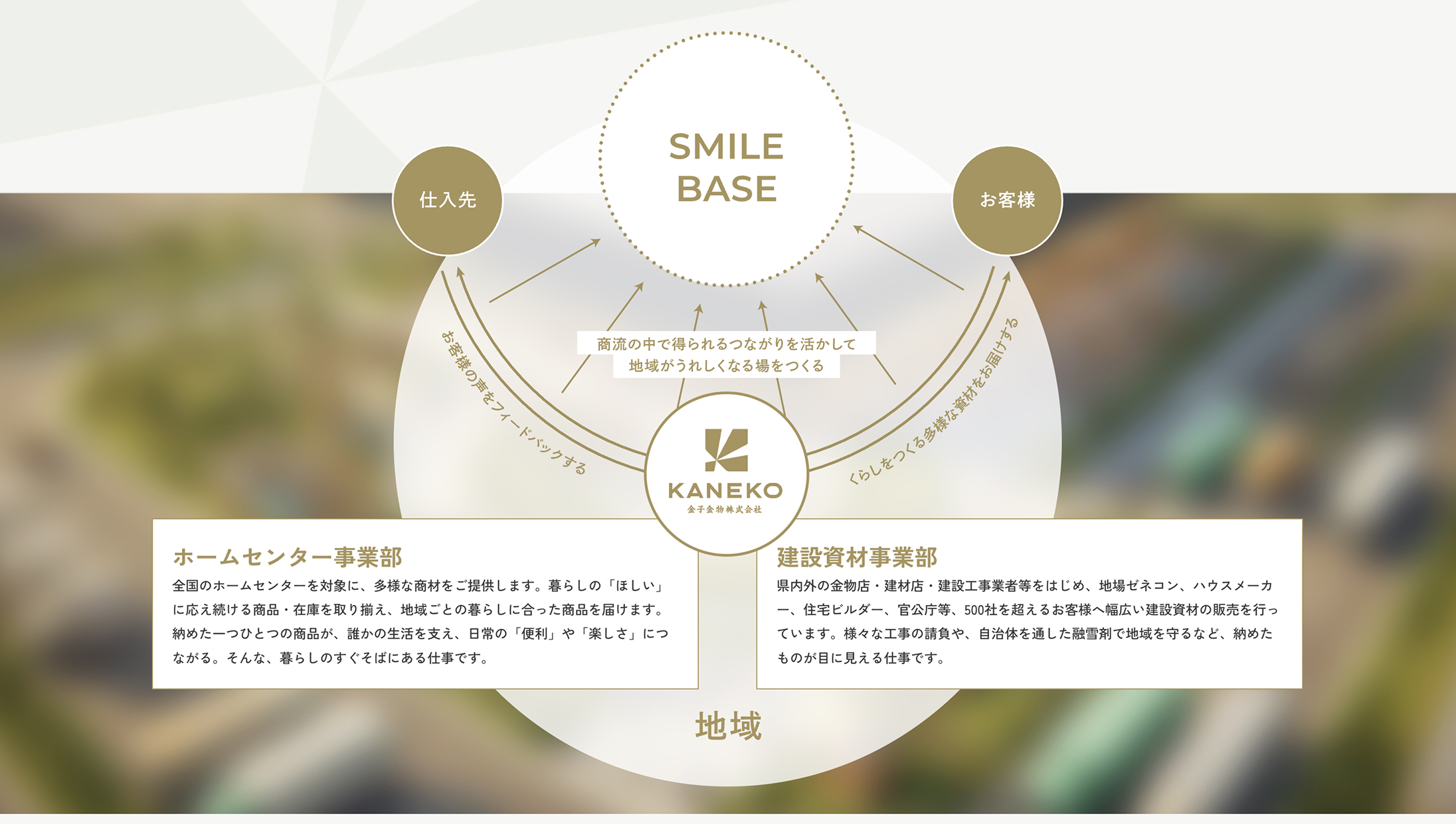 金子氏 : 私たちは棚を直す工具から住宅リフォーム、通学路の安全対策まで、生活の「ほしい」に応えることで地域の暮らしを支えてきました。少子高齢化で担い手が減る中、住まいに関する困りごとや防災の備えなど地域の課題は多様化しています。そこで、卸売業としてお客様同士・仕入先同士をつなぎ、その先で街に笑顔を増やす「SMILE BASE」というビジョンに挑戦しています。