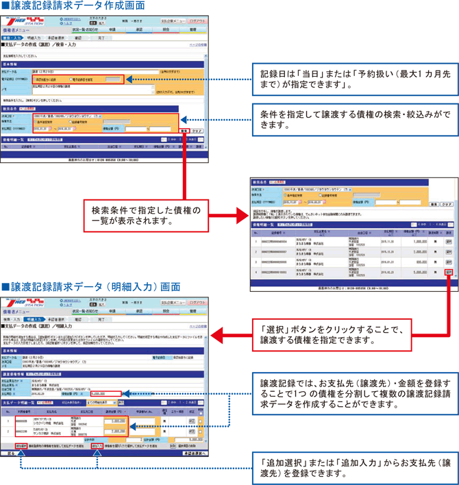 「でんさい」の保有者(債権者)が、他の債権者に「でんさい」を譲渡するために記録請求する機能。 1ヶ月先までの日付を指定した譲渡記録請求の予約が可能です。 (分割譲渡も可能です。) |