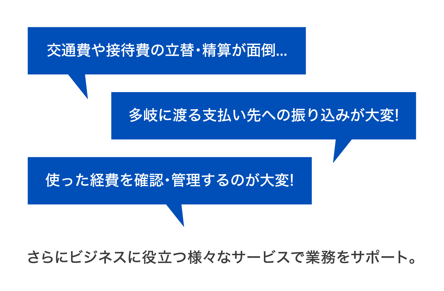 ![[交通費や接待費の立替・精算が面倒…] [多岐に渡る支払い先への振り込みが大変!] [使った経費を確認・管理するのが大変!] さらにビジネスに役立つ様々なサービスで業務をサポート。](/enterpri/jimugorika/img/solu_support_sp.png)