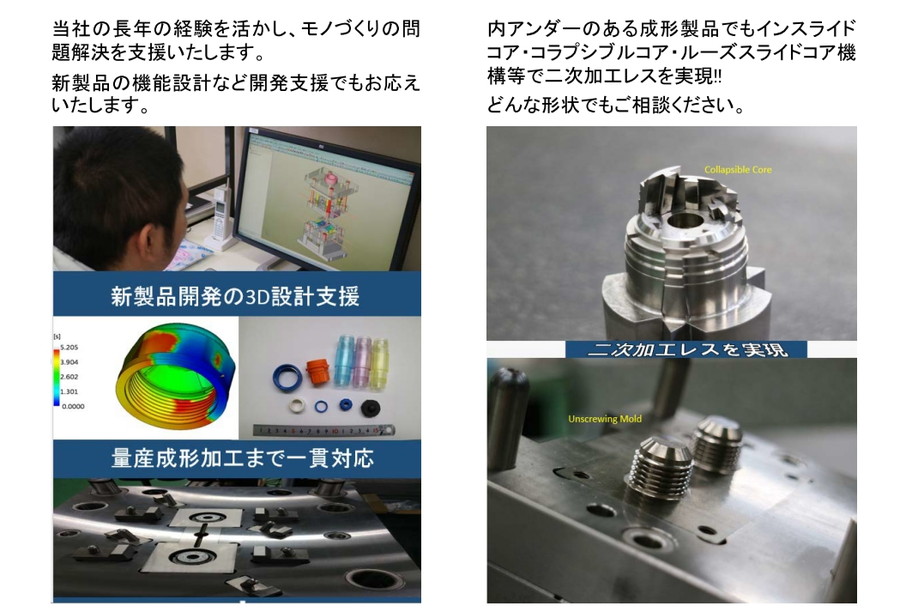 | ● 二次加工付の成形品を金型機構により二次加工レスを実現 ● 当社の金型で次世代自動車用電装部品等が生産されています ● 当社の樹脂製品から医療用機器がつくられています |