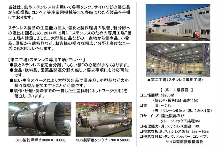 - また、ステンレス製品の生産能力拡大のためのステンレス専用第二工場を建設し、食品・飲料関連、医薬品関連業界などをターゲットとして、新たな市場分野への進出を目指して参ります。