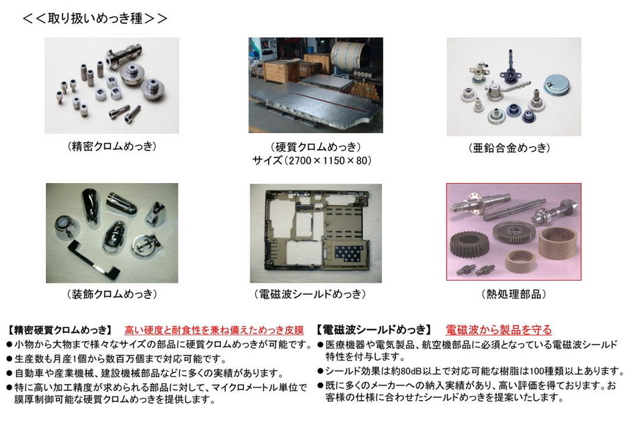 主要製品:硬質クロムめっき、樹脂めっき、亜鉛合金めっき