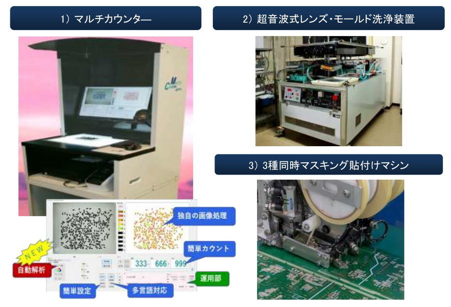 同形状、同寸法部品数量を瞬時に測定 クリーンルーム内で使用するレンズ/モールド/板金類を超音波で洗浄 幅相違のテープを同時に張付け |