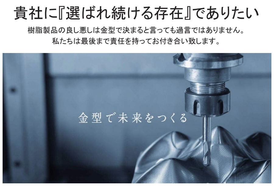 高速マシニングセンタ:2台、NCフライス機:1台、汎用フライス機:2台 型彫放電加工機:1台、成形研削盤:1台、金型反転機:1台 射出成形機(50t):1台 経営理念:『金型で未来を創る』 私たちは生活に欠かせないプラスチック製品の源となる“金型”を通してより良い未来に貢献します |