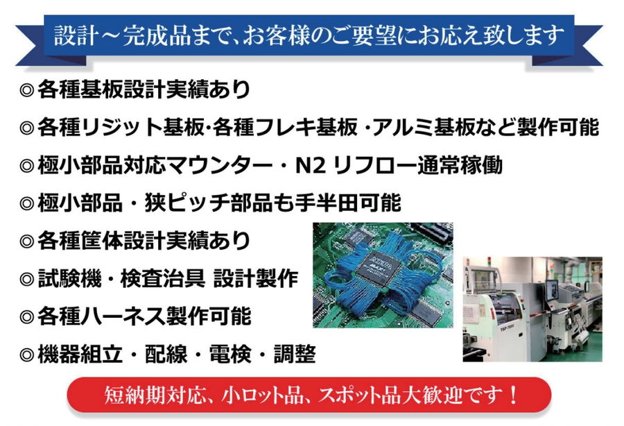 | 主要製品 | プリント基板設計~実装。筐体組立・配線 |