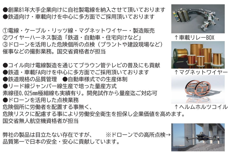 | 主要製品 | リッツ線電線・マグネットワイヤー・カスタム電線・ワイヤーハーネス・コイル巻き・リード線・ジャンパー線 |