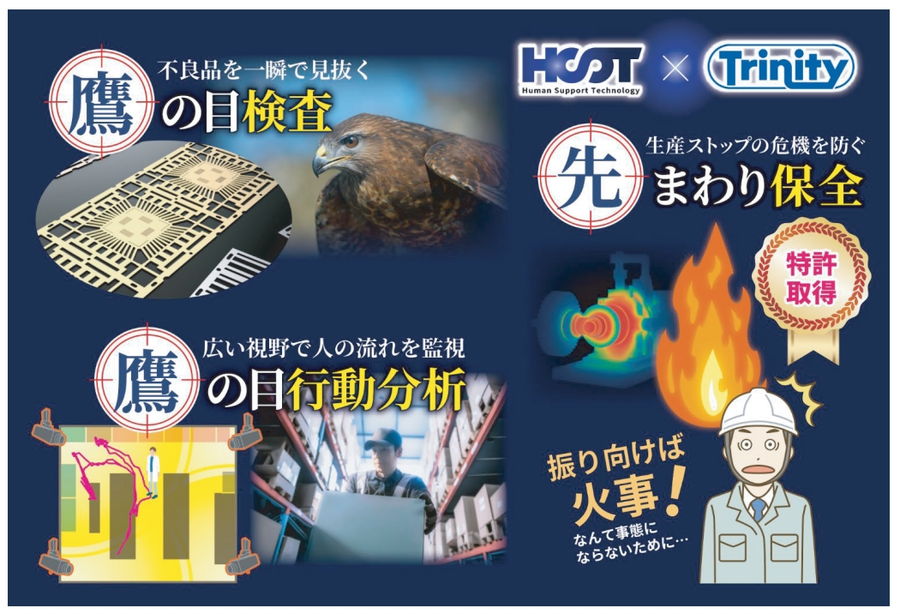 【鷹の目検査】 カメラで1回撮影するだけで、製品の不備を瞬時に検出します。 【鷹の目行動分析】 複数のカメラで死角を補いながら、空間内の人の移動距離・往復回数などを計測します。 【先まわり保全】 大手自動車製造工場にも導入。設備会社ならではの視点で開発された画期的な保全システムです。 |