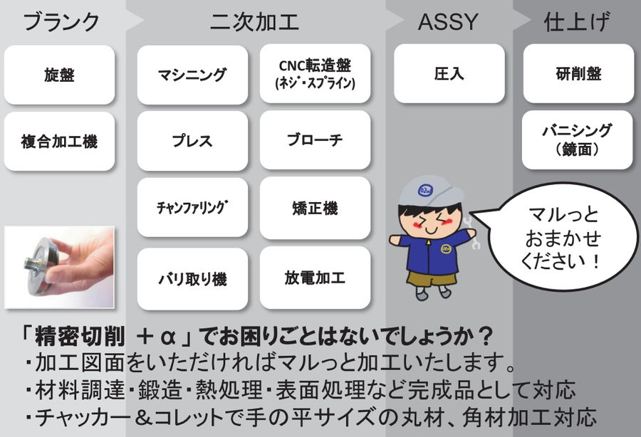 | 主要設備 | CNC複合加工機、チャッカー・コレット |