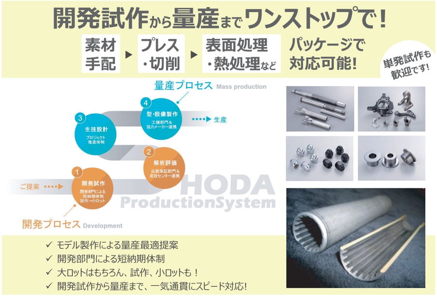 | 主要設備 | 自社製油圧成型機、NC旋盤、MC他 |