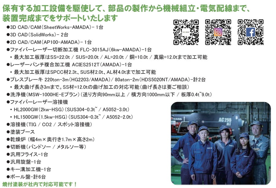 | 主要設備 | 3D-CAD、ファイバーレーザー切断加工機(6kw)、レーザーパンチ複合加工機、プレスブレーキ(220t)、ファイバーレーザー溶接機(2kw)等、乾燥炉など |