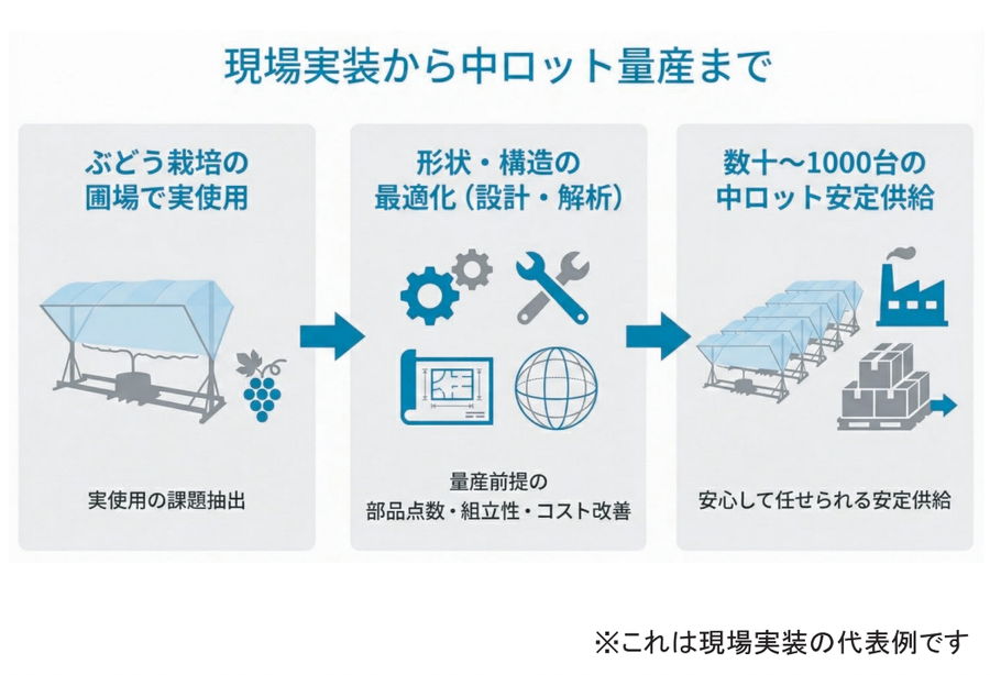 果樹・施設園芸機器、食品一次加工周辺装置、屋外用途のシリーズ型機器メーカ向けに、量産立上げと中ロット供給を一括で支援。 |