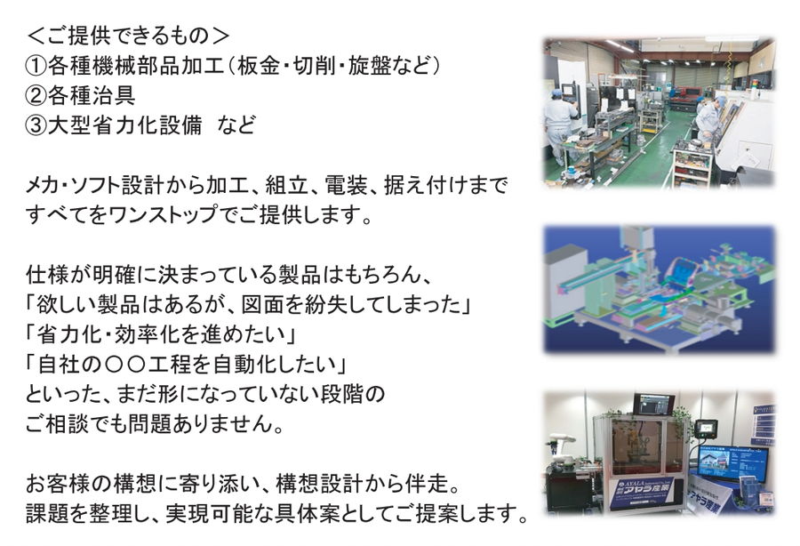 | 主要製品 | 省力化設備、機械部品加工、治具 |