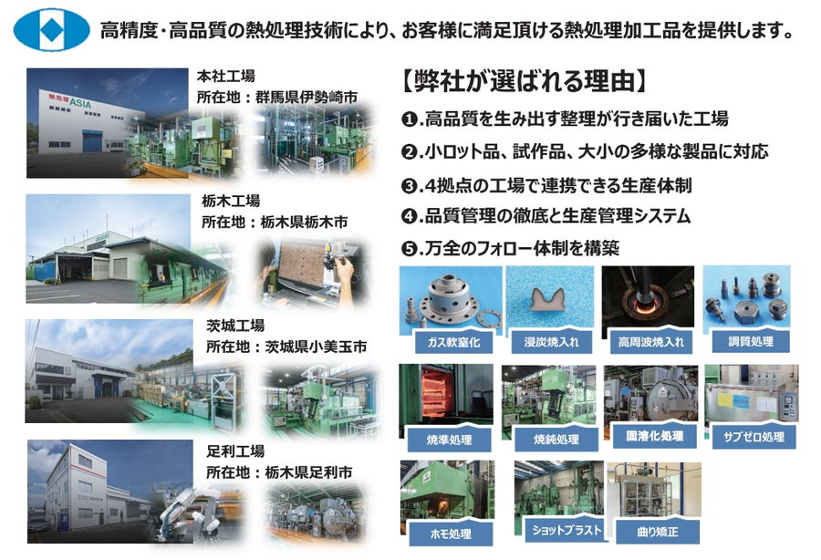 ・バッチ型浸炭窒化炉 17台 ・バッチ型ガス軟窒化炉 3台 ・メッシュベルト式連続炉 2台 ・加圧ガス冷却真空炉 2台 ・高周波焼入装置 2台 ・各種検査装置及びその他 |