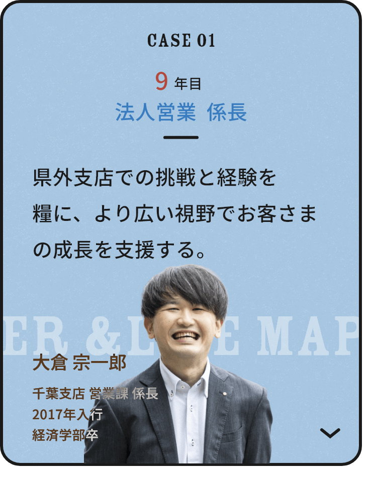 さいたまでの経験を経て千葉支店へ。県外2店舗目となる舞台で、千葉支店の主要なお取引先を任される立場となり、M&Aや事業承継、設備投資など、お客さまの経営の根幹に関わる難易度の高い課題に挑戦することが増える。「金融商品を売る」のではなく、「経営課題を共に解く」ことを意識し、各企業に合わせたオーダーメイドの支援を実践する。