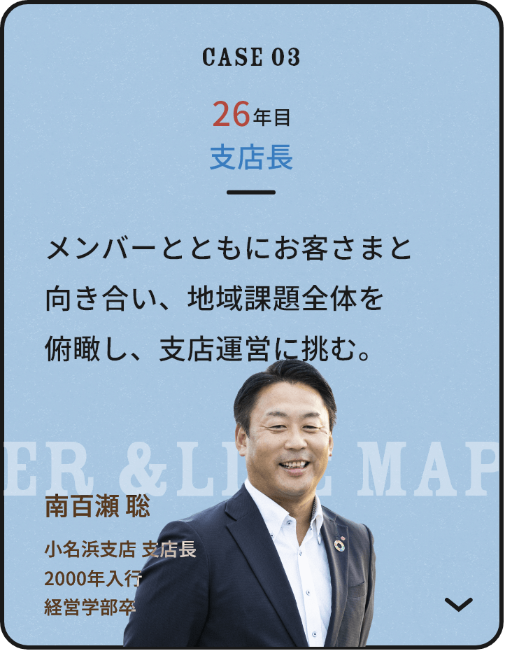 初めて自らの希望で営業店へ復帰。再び福島・小名浜で支店運営にあたる。奇しくもここは、自身が営業としてどうあるべきかを学ぶきっかけをくれた思い出の支店。当時携わったお客さまの会社が大きく成長され、支店長となった今また再会し、「あの時は支援してくれてありがとうございました」とのお言葉をいただけた時、地域のお客さまとともに歩んできたこれまでのキャリアに花を咲かせられたように感じ、改めて誇らしい思いを噛み締めた。