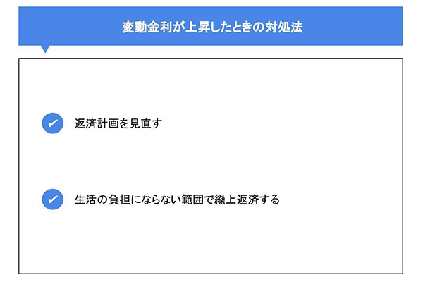 変動金利の上昇により今後の返済が難しい場合は、借入期間を延長して毎月の返済額を減らす、あるいは返済額を一定期間減額するなどの対策を取ります。